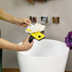 A készletben található két prémium mikroszálas kendő lehetővé teszi a fúvóka hatékony fellazítását és a makacs szennyeződések felszedését a fürdőszobákban és a konyhákban. Még a főzőlapok erős szennyeződései is könnyedén eltávolíthatók. A kényelmes és megbízható horgos-hurkos kialakítás biztonságosan rögzíti a kendőt a kézi fúvókához, és azt jelenti, hogy a kendő gyorsan cserélhető anélkül, hogy szennyeződéssel kellene érintkeznie.